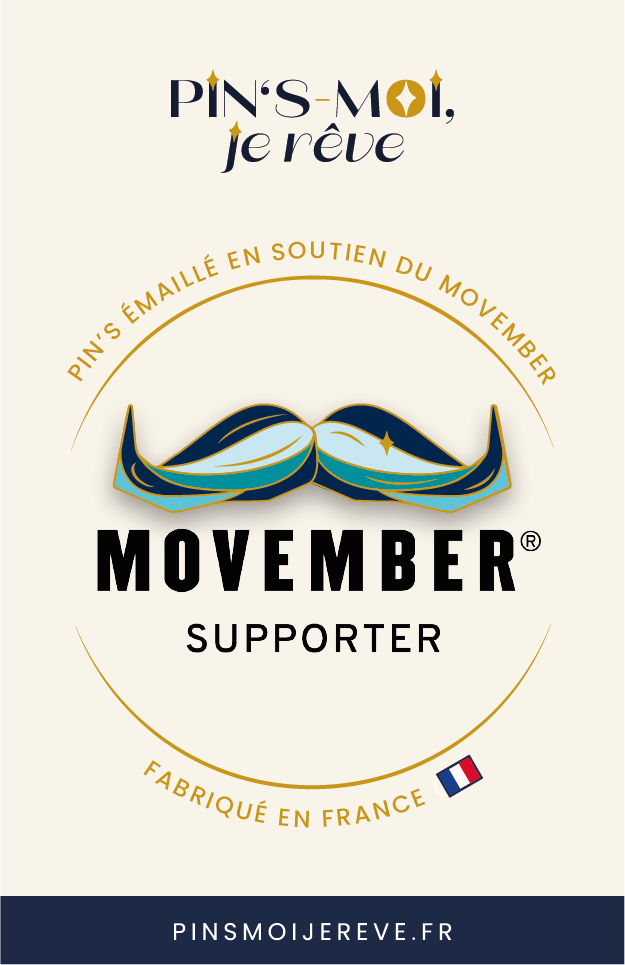 Pour les plus averti·e·s, vous aurez peut-être reconnu le symbole emblématique de l’association Movember : c’est une manière élégante d’afficher votre soutien à une cause importante. Il est bien plus qu’un simple accessoire de mode, c’est un moyen de contribuer à la lutte contre le cancer de la prostate et des testicules ainsi qu’à la promotion de la santé mentale des hommes : en tant que Movember Supporter, pour chaque pin’s vendu je m’engage à reverser 2€ à l’association Movember ! 💪